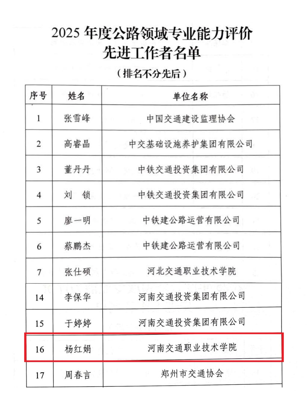 近日,交通运输部职业资格中心公布了2025年度公路领域专业能力评价工作评选结果。我校凭借在专业能力评价工作中的突出表现,荣获“优秀实施机构”称号,鉴定中心杨红娟老师被评为“先进工作者”。