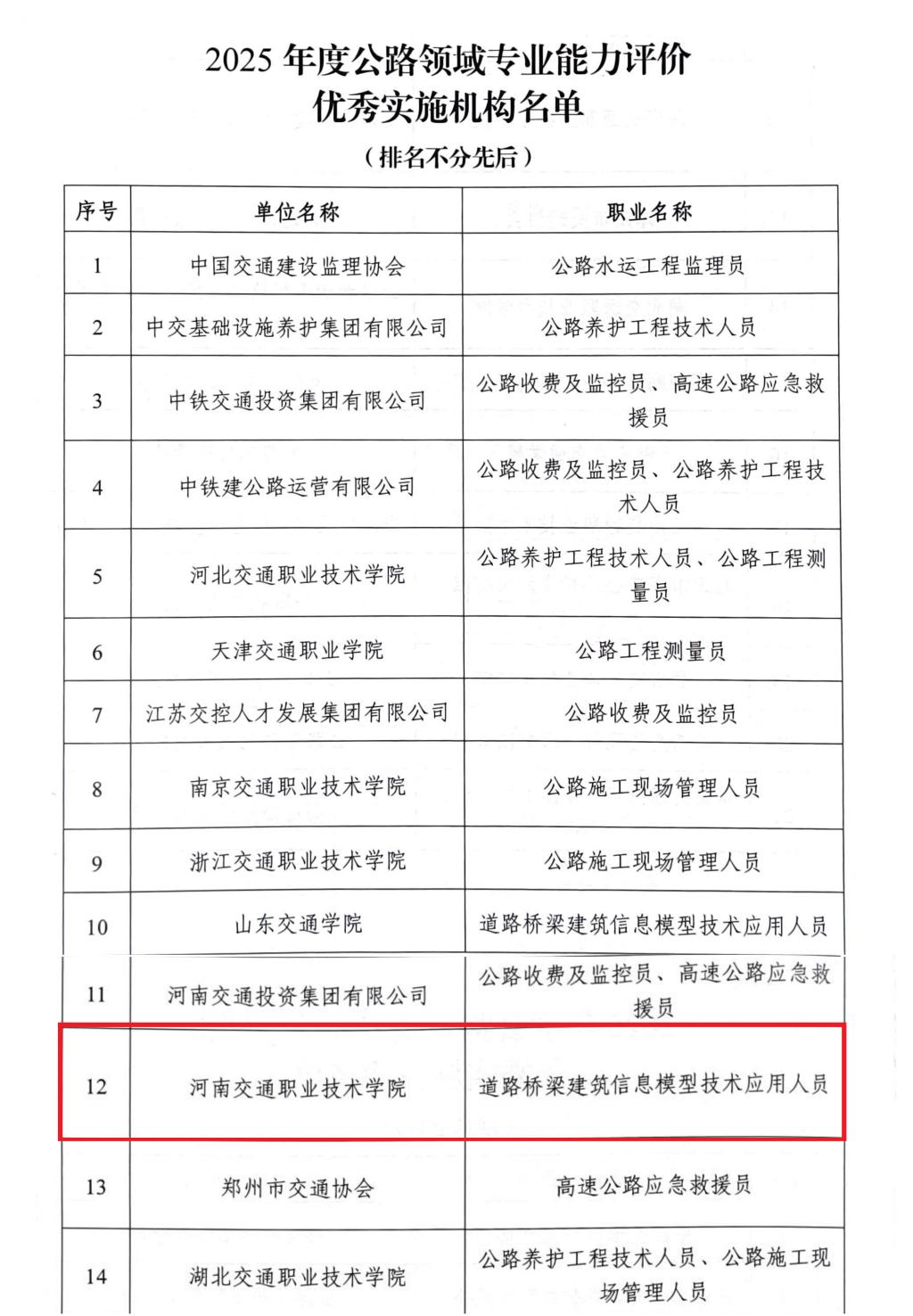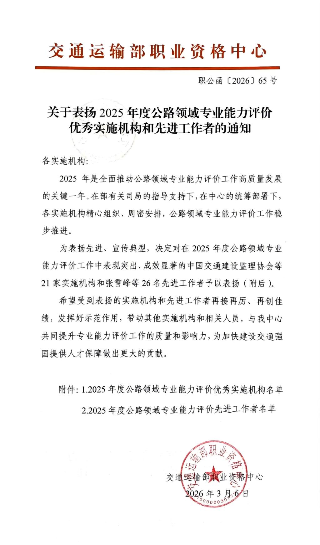 此次获评优秀实施机构,是交通运输部职业资格中心对学校公路领域人才评价工作的高度认可。学校将以此为契机,进一步规范评价流程、提升评价质量,充分发挥资源优势,为加快建设交通强国提供坚实的人才支撑。
